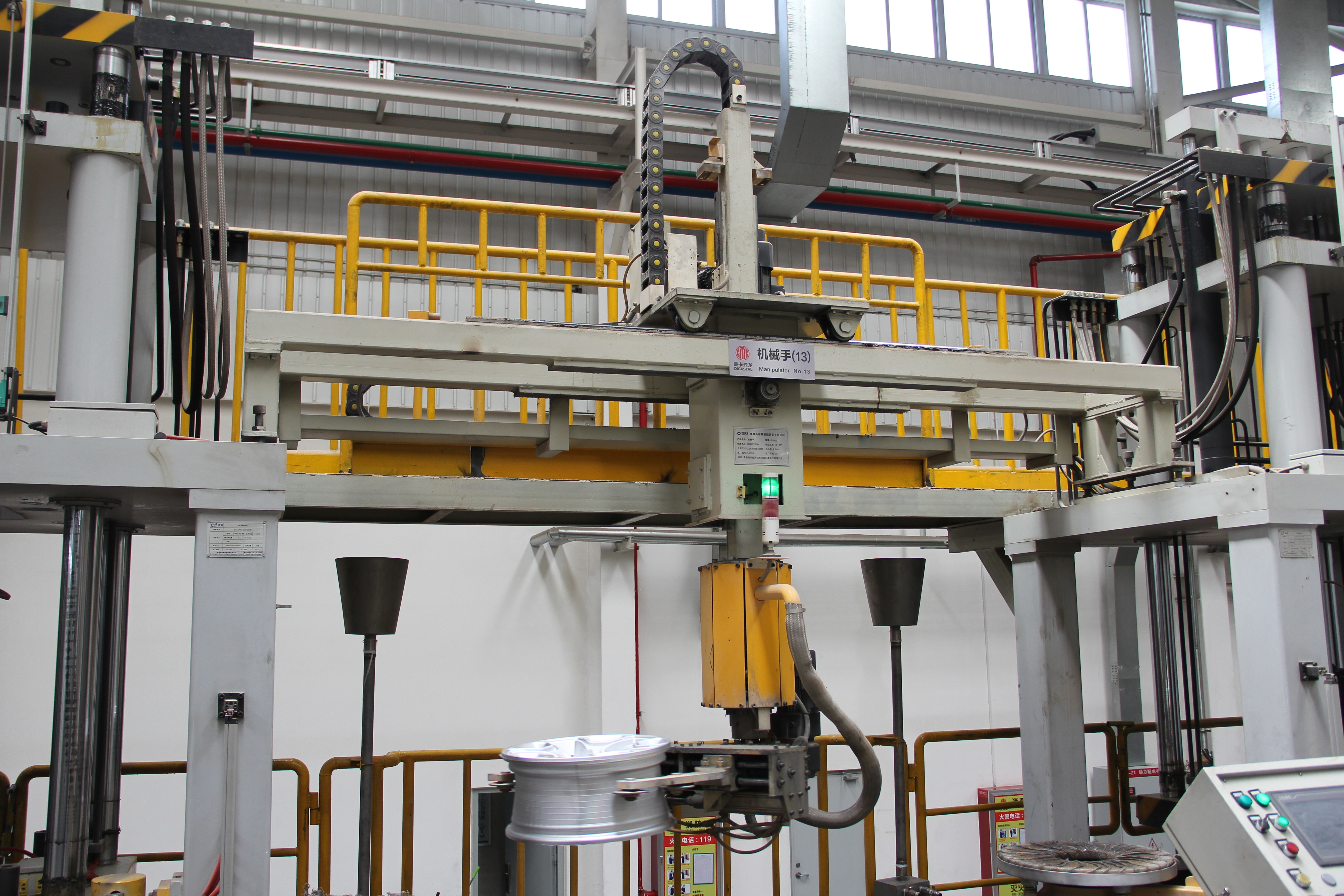 用于低压铸造机生产的热毛坯轮毂的全自动取料、淬水冷却、翻转控水、升降转运等自动化过程。压铸机配备机械手后可实现一人操作四台压铸机,大幅降低员工劳动强度及人力成本。该设备采用伺服电机驱动,配精密行星减速机,运行平稳,反向间隙小,定位准确,寿命长。