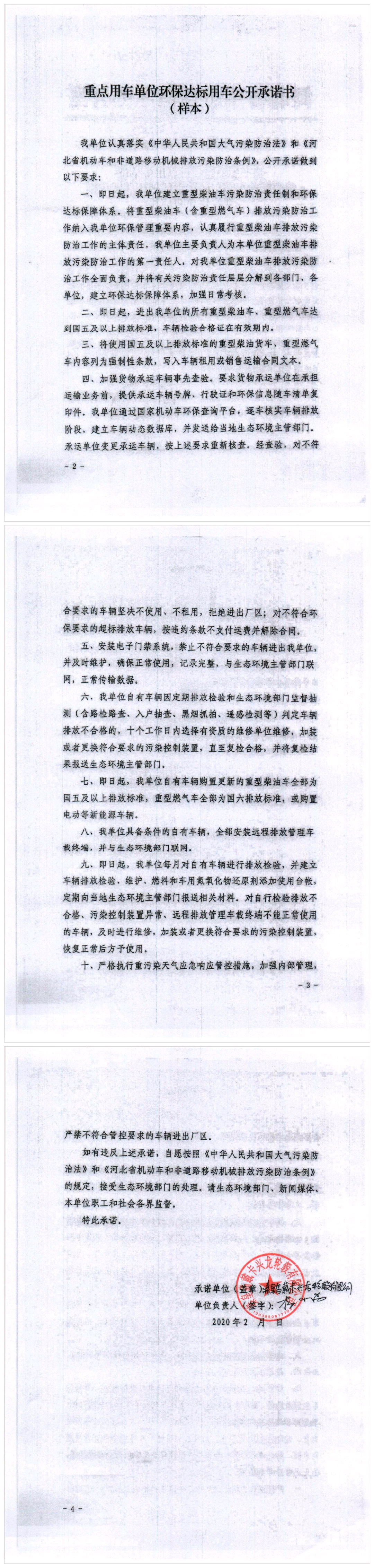 秦皇岛戴卡兴龙轮毂有限公司重点用车单位环保达标用车公开承诺书