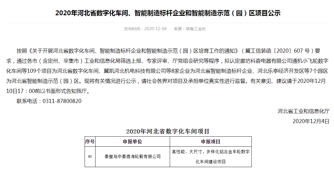 · 中秦渤海公司高性能、大尺寸、多样化铝合金车轮数字化车间建设项目被省工信评为省级数字化车间